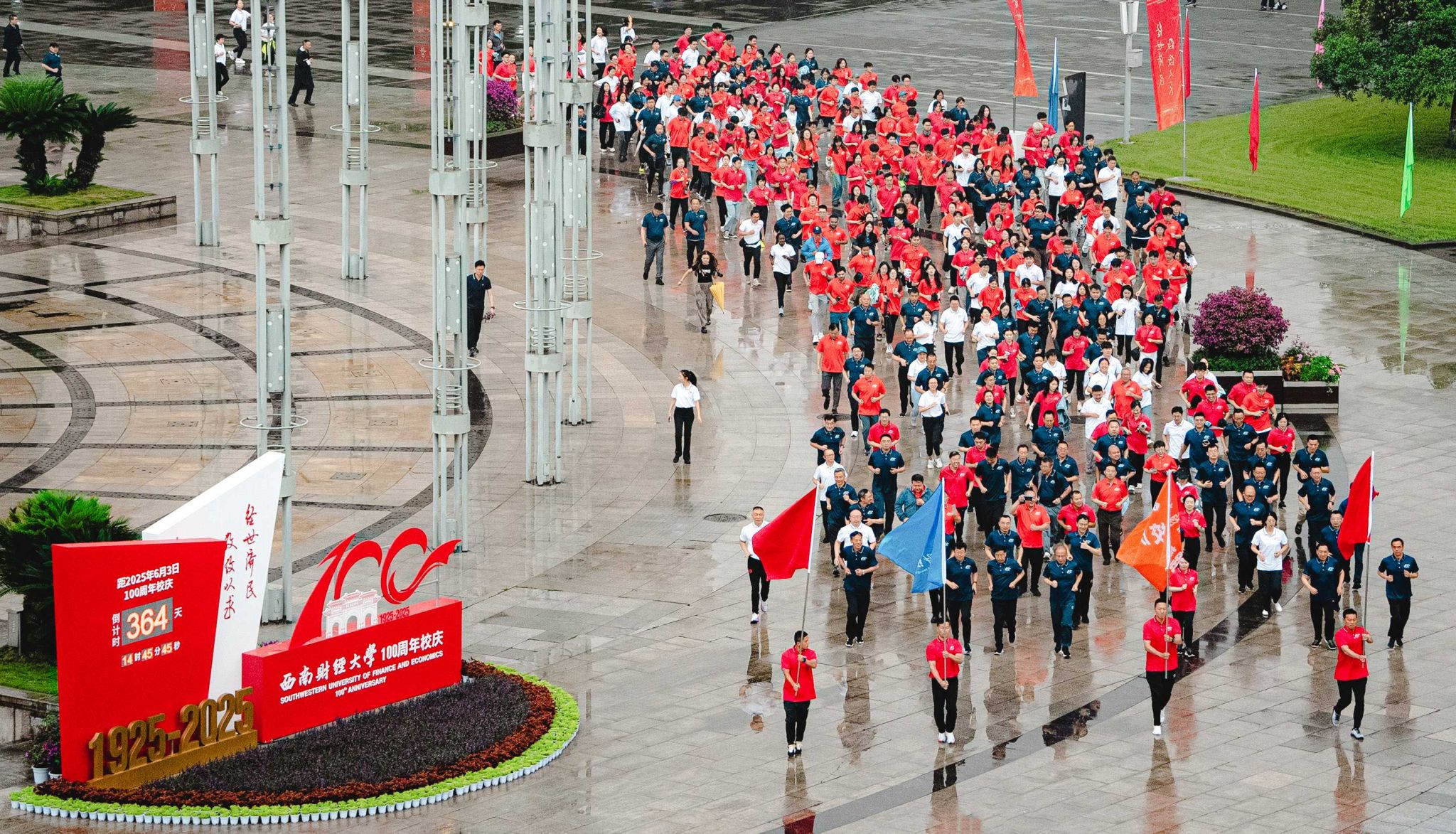 从光华大学门到北大门的跑步路线,宛如一道从黄浦江畔启航,一路铿锵一路芬芳,点亮蓉城华章的历史之光,照耀辉映着西南财大99载与民族共命运、与时代相偕行的峥嵘岁月。队伍从光华大学门出发,沿着光华路上的西财历史文脉,来到济民广场。“百年西财、生日快乐”“经世济民、孜孜以求”的口号响彻济民广场上空,每一声既包含着西财人在百年风华正茂中始终胸怀“国之大者”、心系“民之所向”的家国深情,也饱含西财人在迈向百年、启程新百年的征途中一往无前、踔厉奋进、再谱华章的进取气魄。