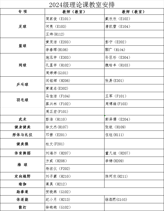 经教务处同意,本学期2024级本科生第3周体育课为博鱼官方网站(中国)集团有限公司理论课,9月29日起恢复户外教学。根据教室资源状况,现将理论课具体安排通知如下: