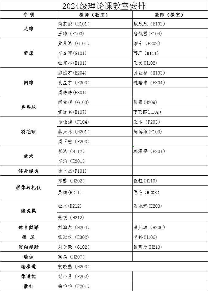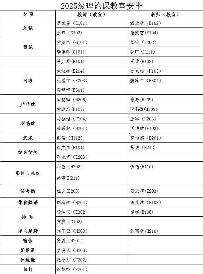 经教务处同意,本学期2024级、2025级本科生第13周体育课为博鱼官方网站(中国)集团有限公司理论课,12月8日起恢复户外教学。根据教室资源状况,现将理论课具体安排通知如下: