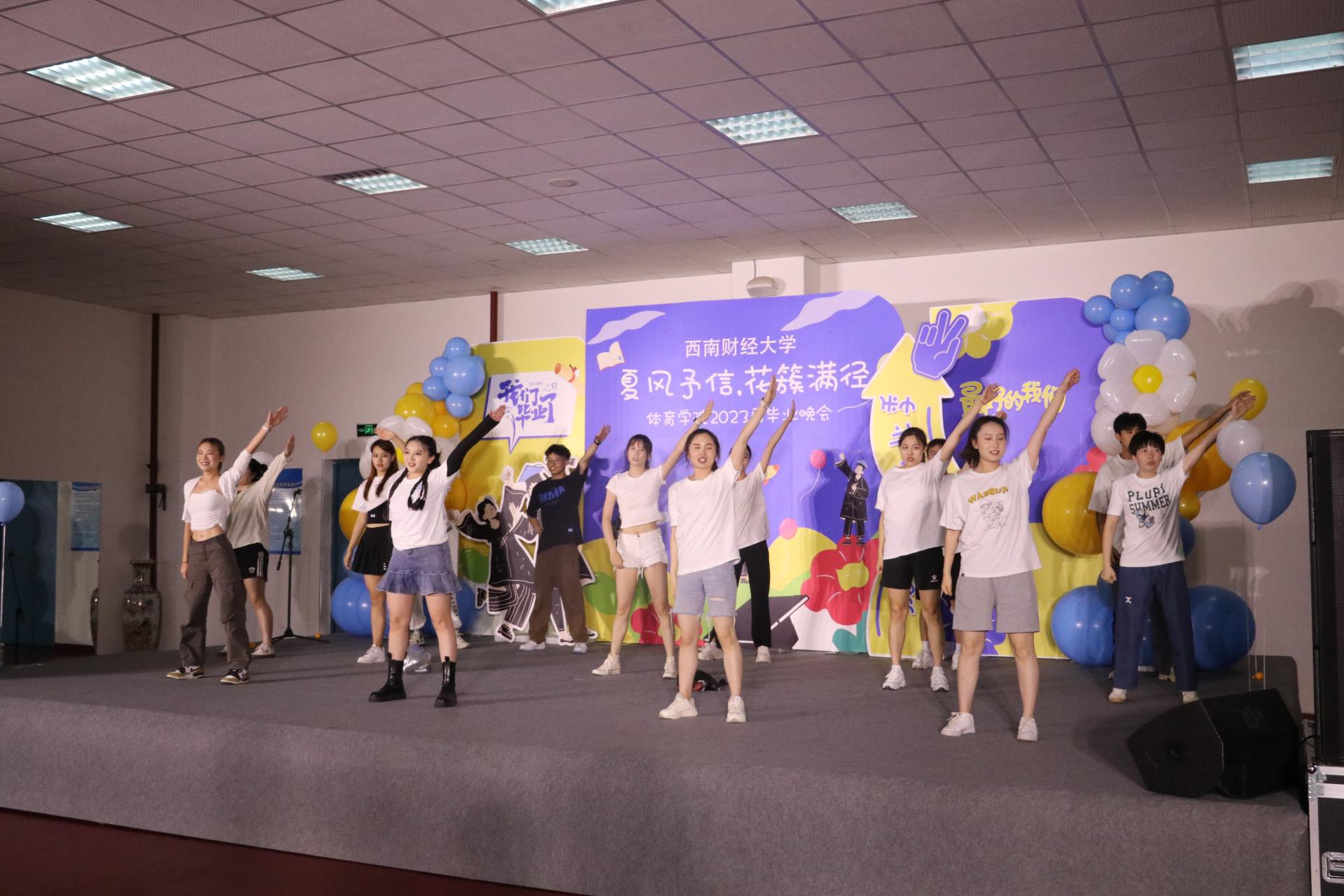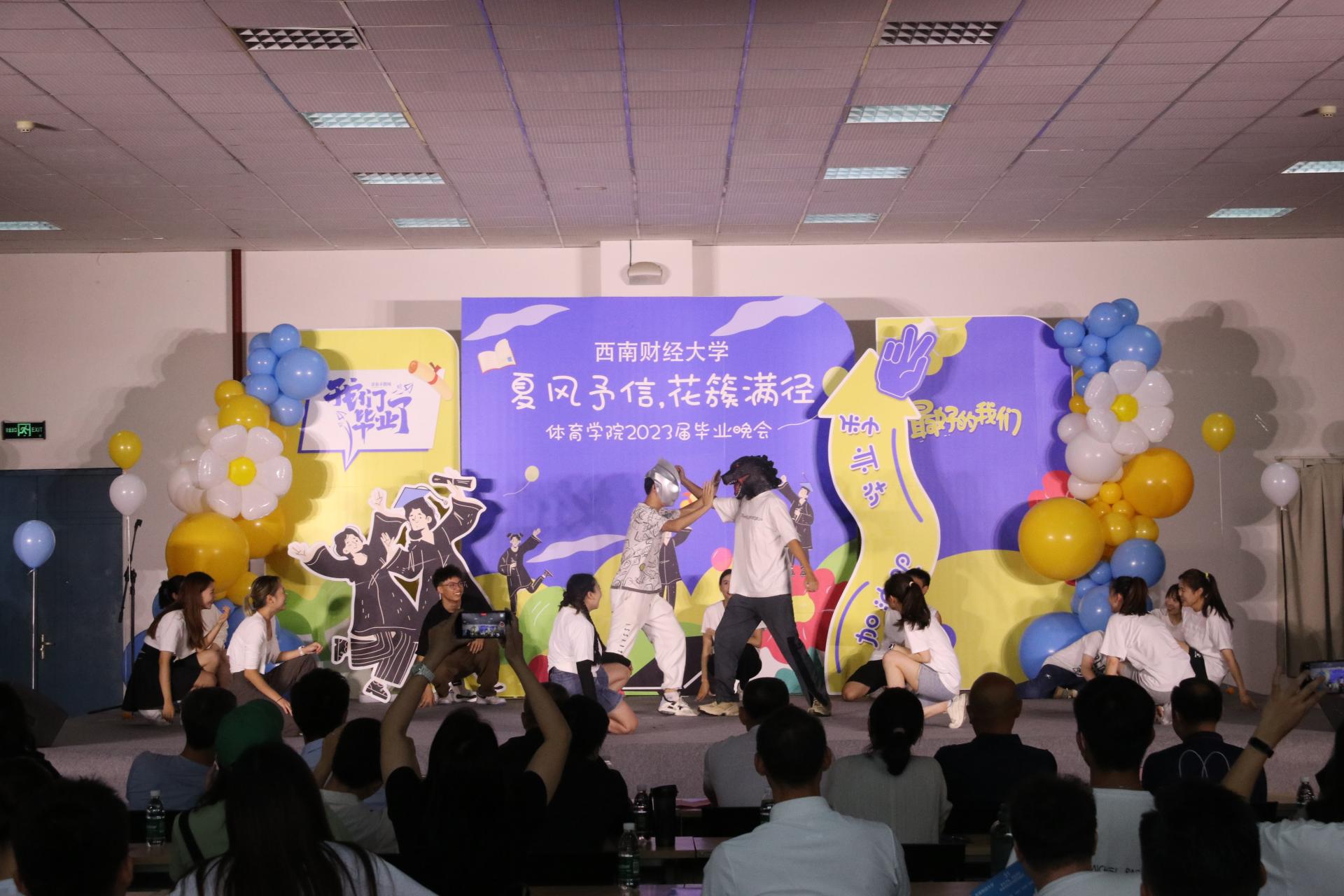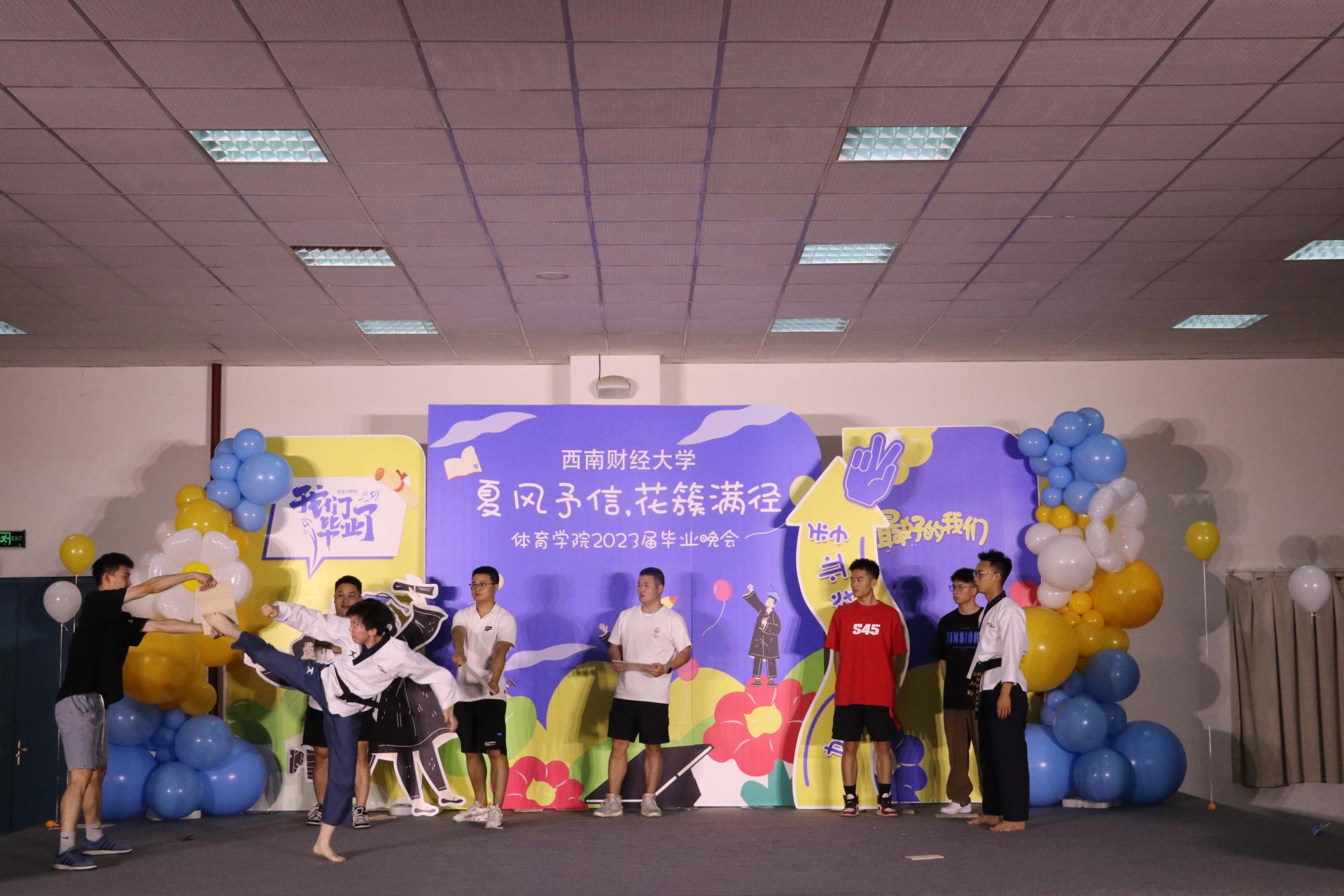 接下来同学们带来了丰富多彩的表演节目。歌曲《我的好兄弟》、《别怕变老》、《遥远的她》;唱跳《失恋阵线联盟》、《奇迹再现》;诗歌朗诵以及跆拳道、拉丁舞、古筝舞等表演。展现出西财体育学子积极进取的精神面貌,也表达了学院对毕业学子的深深祝福。
