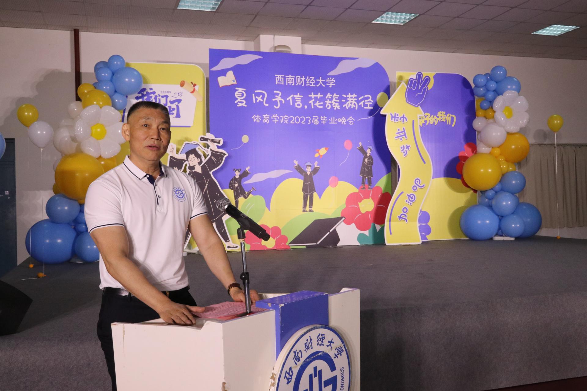博鱼官方网站(中国)集团有限公司院长杨远波教授首先致辞,祝贺学院2023届毕业生顺利完成学业,踏上新的人生旅途,同时向辛勤付出的老师们表示最诚挚的敬意。他希望同学们牢记习近平总书记嘱托,胸怀天下立大志,培根铸魂明大德,锐意进取成大才,实干笃行担大任,坚定理想信念,永远听党话、跟党走,矢志奉献国家和人民,成为在社会主义现代化建设中可堪大用、能担重任的栋梁之才。叮嘱同学们秉承“睿智健体、经世济民”的西财体育人文精神,让青春在体育强国建设中绽放绚烂之光。
